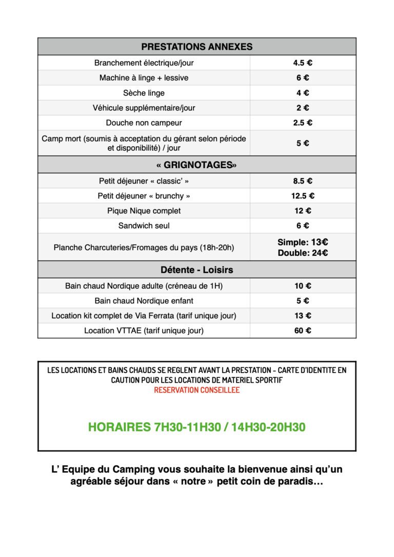 - Prestations courantes, tarifs ? Pour 2 pers + véhicule 15€ la nuit / Pour 2 pers.+ véhicule+électricité : 19,50€ la nuit / Formule bivouac Un randonneur ou cycliste avec sa tente : 10€/nuit …